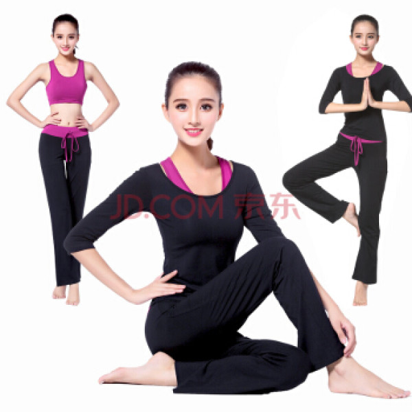 潮流假期 瑜伽服女套装莫代尔专业三件套秋冬新款中袖健身舞蹈服 UJ20165-黑配紫红色-中袖三件套-M