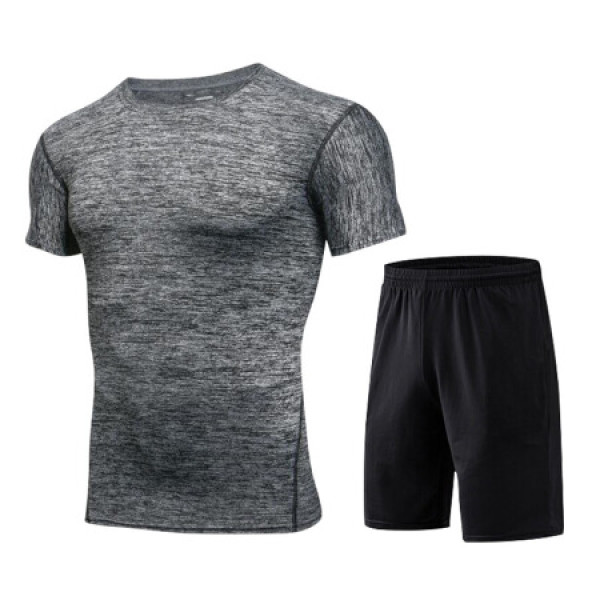 潮流假期 运动套装男健身服跑步短裤T恤薄款透气速干衣足球篮球短袖训练服 NZ9006-灰色-短袖两件套-L