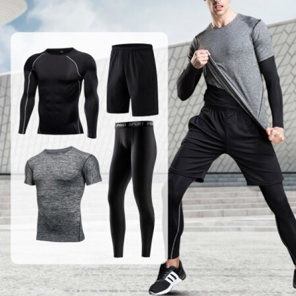 潮流假期 运动套装男健身服跑步短裤T恤薄款透气速干衣足球篮球短袖训练服 NZ9006-灰色-短袖长袖四件套-XL