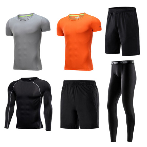 潮流假期 运动套装男健身服男跑步运动短袖速干透气短袖套装六件套 NZ9008-灰+橙色-短袖长袖六件套-M