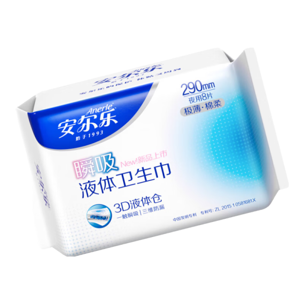 安尔乐瞬吸液体卫生巾极薄无感防漏夜用290mm8片【品牌直供 安心品质】