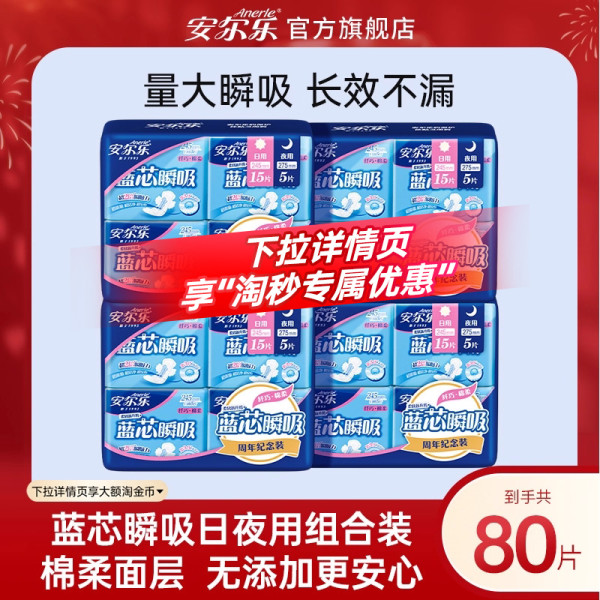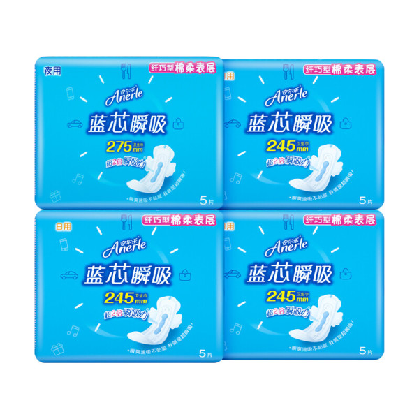 安尔乐(Anerle)卫生巾日夜用组合蓝芯瞬吸系列纤巧柔棉面层姨妈巾女 【蓝芯瞬吸】4包80片
