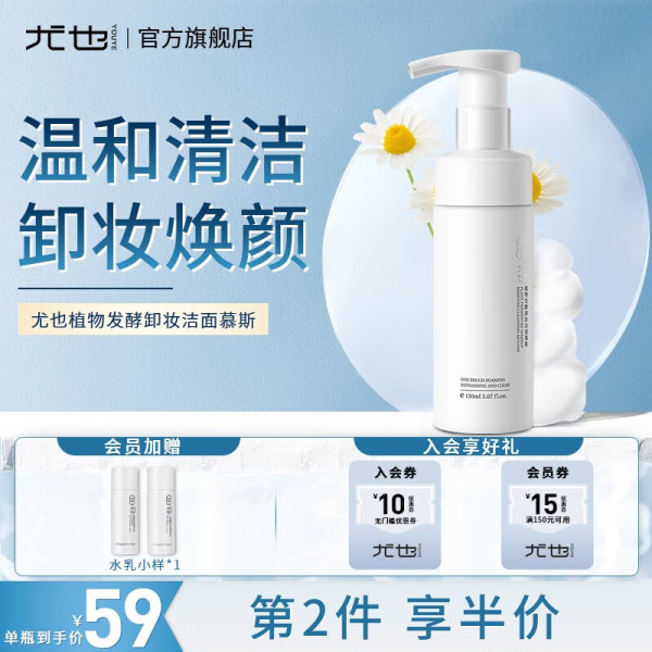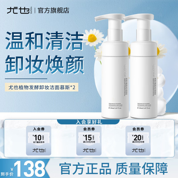 尤也 植物发酵洁面慕斯清洁卸妆二合一泡沫洗面奶 两瓶装 洁面慕斯 150ml *2