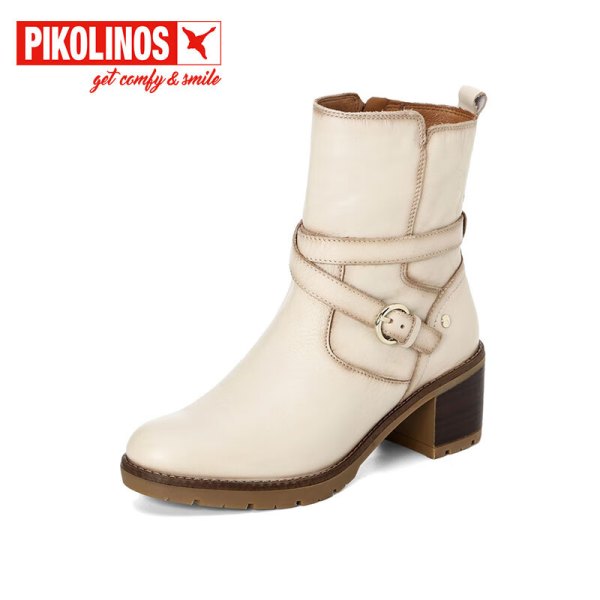 PIKOLINOS 派高雁冬季牛皮侧拉链圆头纯色粗跟通勤短靴PA237011 米白色 37