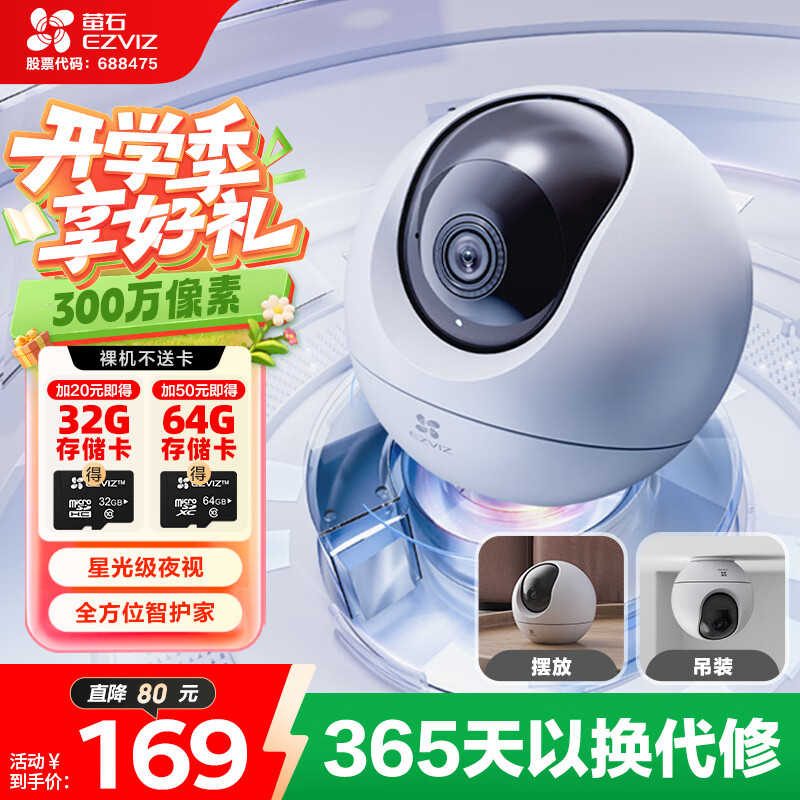 萤石C8b灯座款云台机 300万超清 自带4G网络 智能监控器家用摄像头 监控照明 全彩夜视婴儿看护器