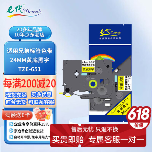 e代 eternal 标签带12mm白底黑字TZe-231适用brother兄弟PT-D210标签机P700 900打印机色带D450不干胶标签纸打印纸e100 黄底黑字 24mm