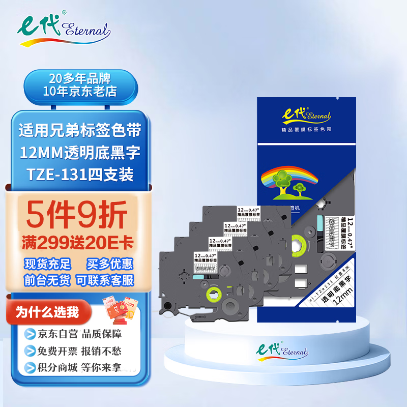 e代标签色带12mm透明底黑字TZe-131色带4支装 适用brother兄弟PT-D210标签机打印机标签纸打印纸
