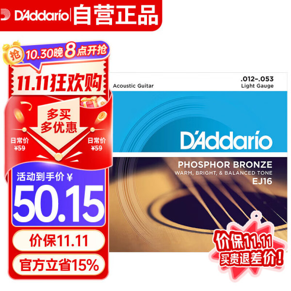达达里奥 EJ16 美国进口民谣吉他琴弦 碳素钢弦套弦12-53磷铜
