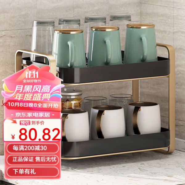 创丰达 水杯架置物架杯具收纳架桌面双层沥水架家用玻璃杯收纳置物架 水杯沥水置物架(黑金色)KD款
