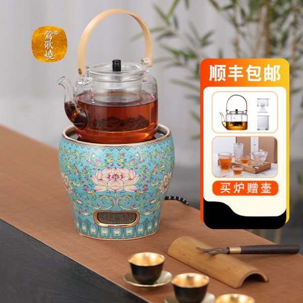 莺歌烧 电陶炉茶炉煮茶器无线遥控轻音泡茶烧水炉 珐琅彩 宝蓝底莲花风炉(含两用玻璃壶)