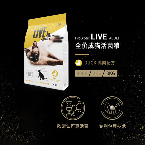 PROBIOTIC LIVE Live猫粮 西班牙进口成猫幼猫通用活菌粮 鸭肉味|成猫粮8kg