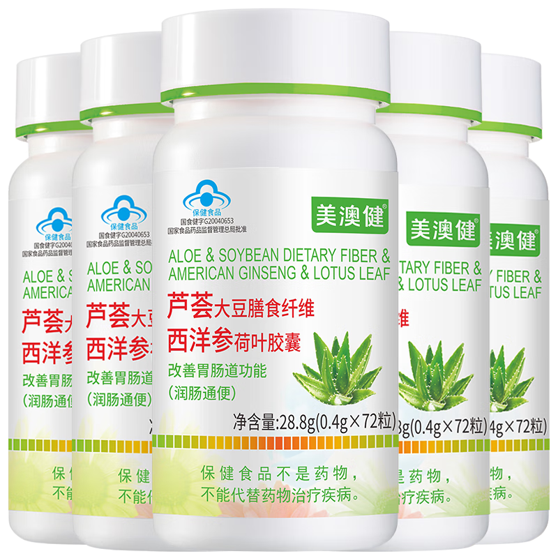美澳健(MEIAOJIAN)芦荟胶囊大豆膳食纤维西洋参荷叶胶囊润肠通便秘成人中老年清宿便 芦荟胶囊 72粒*5瓶 (无赠品)