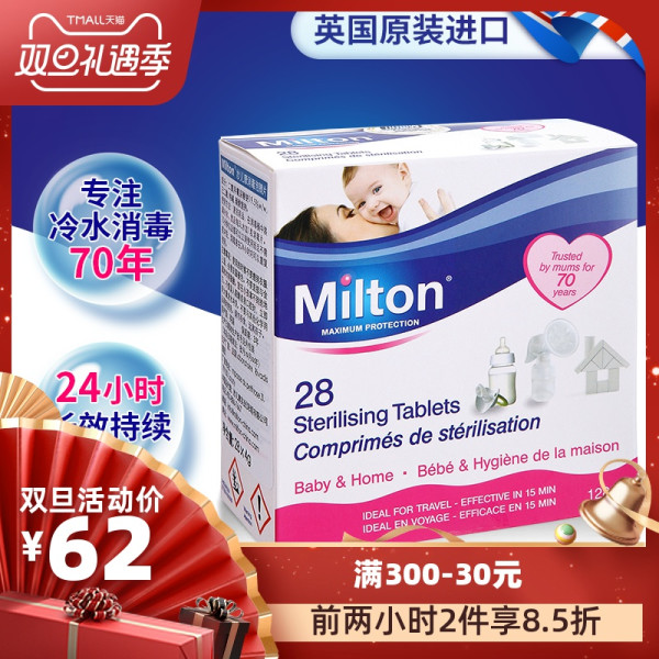 Milton品牌成立于1916年,是欧洲百年消毒品牌,深受英国各大医院的信赖和采用。其消毒产品能有效杀死99.99%的细菌、病毒和霉菌,特别适合婴儿用品的消毒。Milton提供“婴幼儿专用消毒片”,每片可以泡制5升消毒液,15分钟内即可完成奶瓶、奶嘴、玩具、餐具等物品的消毒。