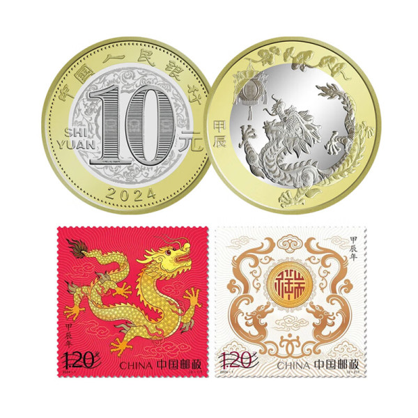 邮币卡 2024甲辰龙年生肖纪念币 二轮生肖纪念币 2024龙币1枚+龙邮票2张