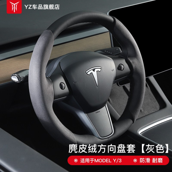 YZ适用tesla特斯拉model3Y方向盘套超薄吸汗车内饰装饰改装丫配件 Model 3/Y原厂麂皮绒运动方向盘套-灰色