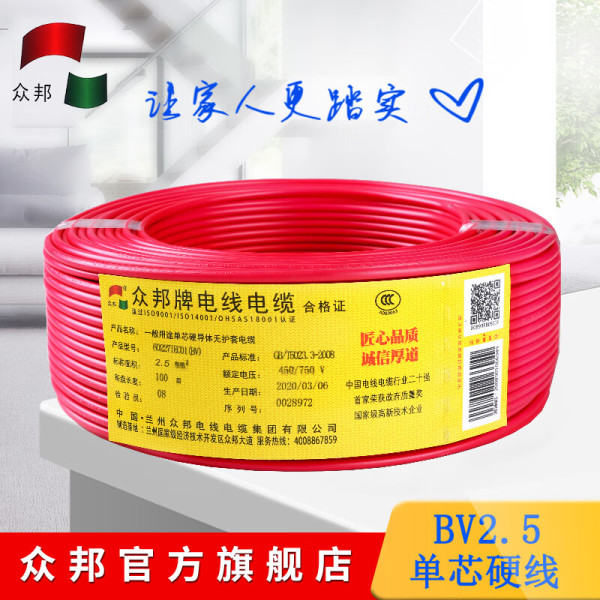 众邦电线电缆 国标BV2.5平方 家用 单芯单股硬铜芯线 足米 红色 100米