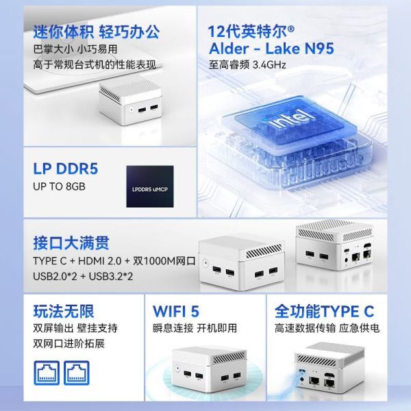 摩方 N150迷你主机 带全功能Type-C口,板载12G D5内存,512G 固态