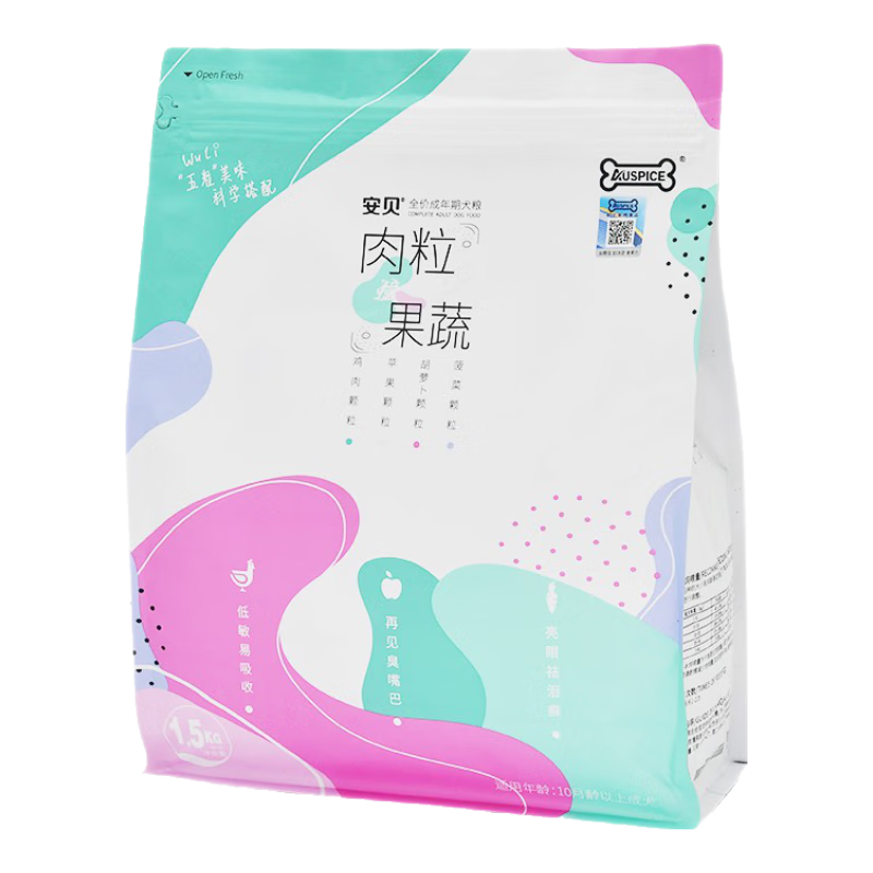 安贝(Auspice)狗粮宠物犬粮五粒牛肉鸡肉果蔬全价小型犬幼粮皮毛护理呵护肠道 鸡肉果蔬1.5公斤日期26.03