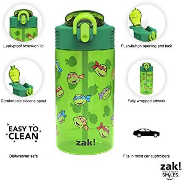 zak! designs Zak Designs 忍者神龟儿童水瓶,适合学校或旅行,16 盎司(约 453.6 克)2 件装耐用塑料水瓶,带吸