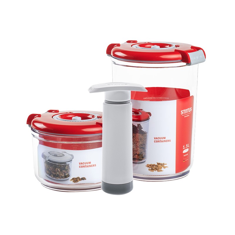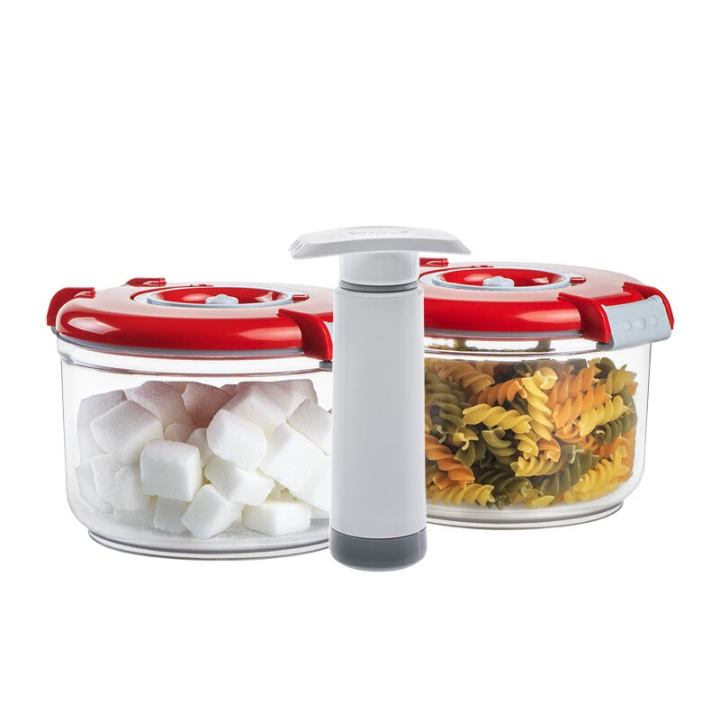 STNTUS innovations 鲜途保鲜盒冰箱专用水果食品真空保鲜盒进口圆形饭盒微波炉加热 0.75L 1.5L套装红色 手动泵
