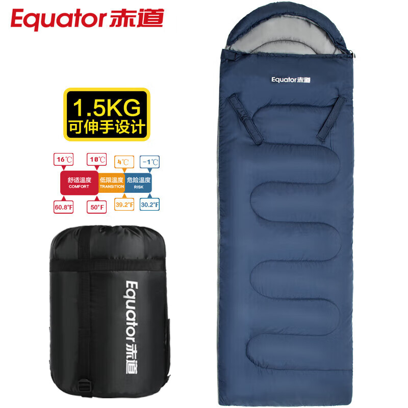 赤道户外睡袋成人春秋冬加厚保暖四季单人露营办公室午休便携信封睡袋 1.5KG 藏青【可伸手】