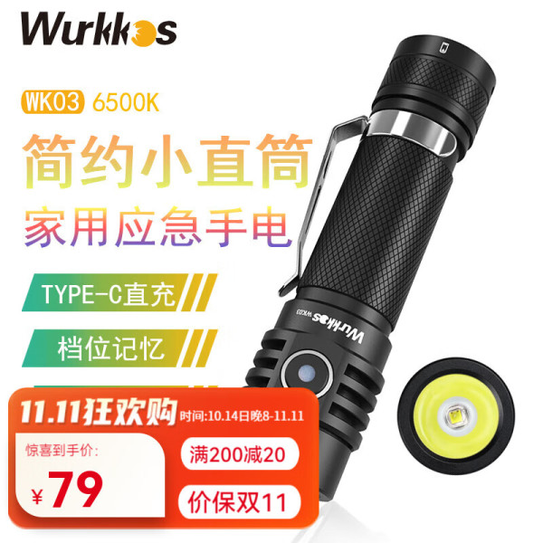 WURKKOS沃克思达 手电筒小型户外露营照明灯1800lm 可直充便携手电 黑色单只[6500K]无电池