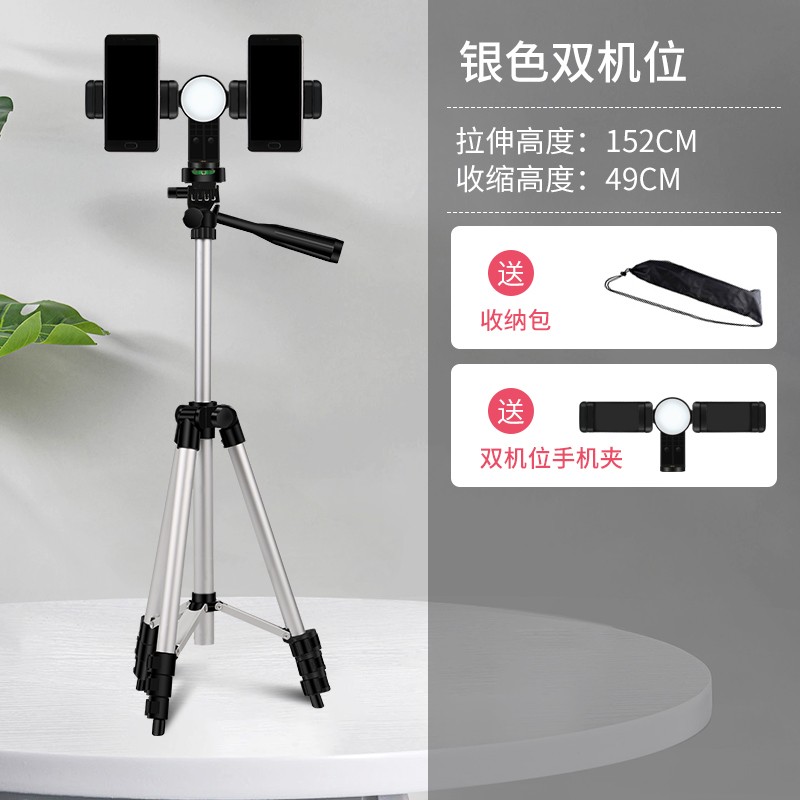 多宝莱 X9拍照主播手机三脚架床头直播支架三角架桌面户外懒人相机便携自拍火山小视频西瓜视频 升级银色双机位152(两件配)