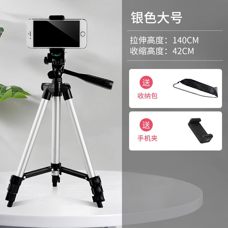 多宝莱 X9拍照主播手机三脚架床头直播支架三角架桌面户外懒人相机便携自拍火山小视频西瓜视频 银色140cm 手机夹 收纳包