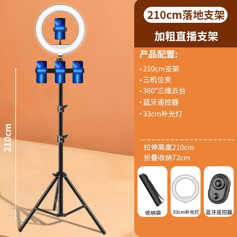 多宝莱 【一夹两用】手机支架直播三脚架ipad平板考研复试网课通用架子拍摄视频拍照自拍神器落地网红 2.1米四机位 33厘米灯 蓝牙
