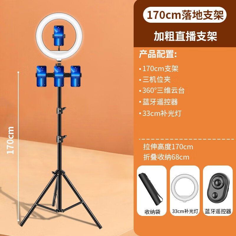 多宝莱 【一夹两用】手机支架直播三脚架ipad平板考研复试网课通用架子拍摄视频拍照自拍神器落地网红 1.7米单机位 33厘米灯 蓝牙