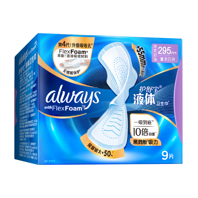 护舒宝液体卫生巾9片超长295mm量多日用夜用超薄进口姨妈巾无感保护