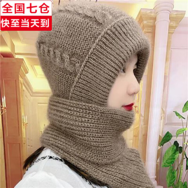 鑫铎毛线帽子女秋冬加绒加厚保暖骑车帽子围巾一体松鼠绒连体风雪帽 亚麻色【加绒加厚】 均码