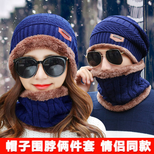 鑫铎 毛线帽子男士秋冬季加绒针织帽女韩版潮套头帽围脖套装护耳保暖帽 藏青 均码有弹力