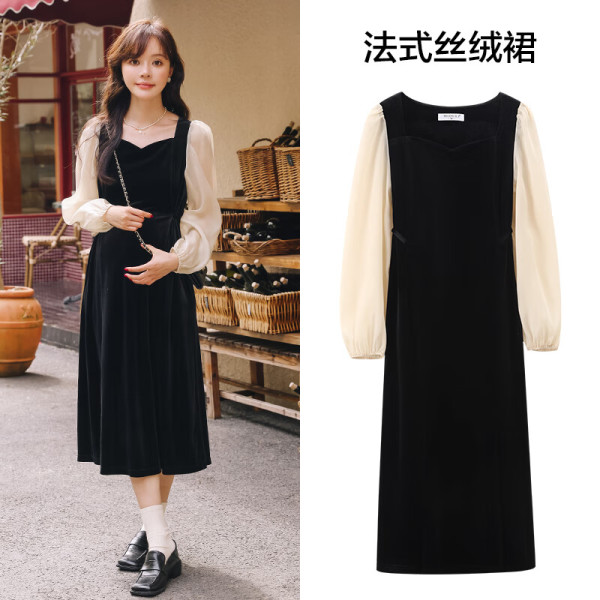米度丽装早春连衣裙2024连衣裙秋冬丝绒长裙小香风时尚洋气 黑色 M码
