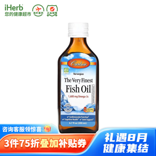 Carlson 康一生 优质鱼油 蜜桃味 1 600 毫克 6.7 液量盎司(200 毫升)
