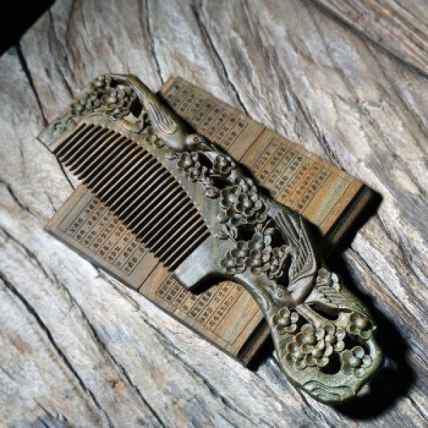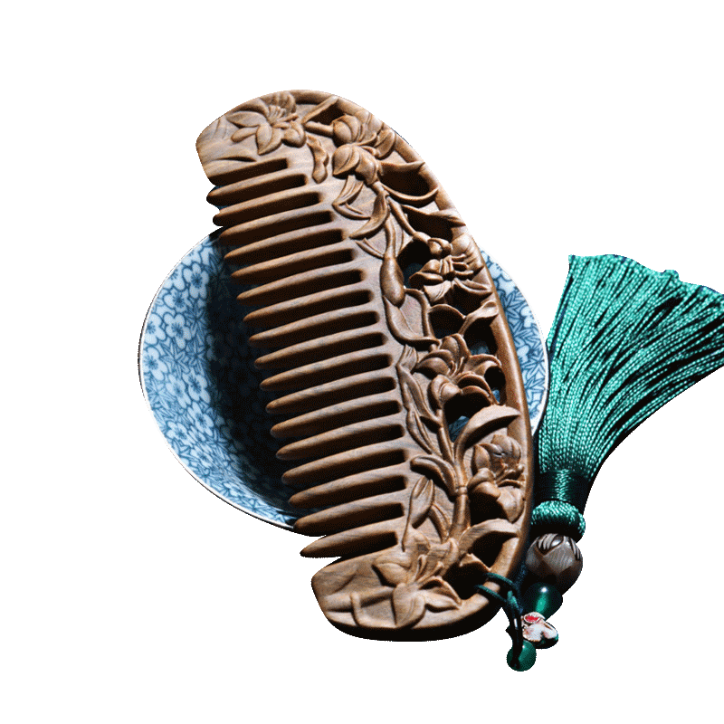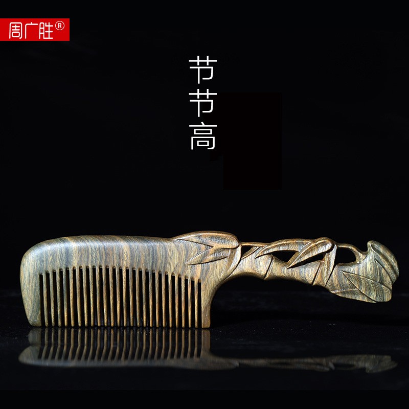 周广胜 绿檀雕花木梳子 原木色
