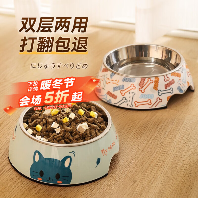 华元宠具(hoopet)狗狗碗狗盆不锈钢猫咪碗食盆喂食喝水宠物防打翻狗粮猫粮专用饭盆 双层蓝猫 打翻可退 m