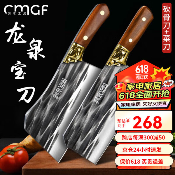 创木工房 龙泉菜刀锻打家用刀具套装切片刀不锈钢厨具切肉刀剁骨刀厨刀 龙泉手工锻打菜刀+斩骨刀