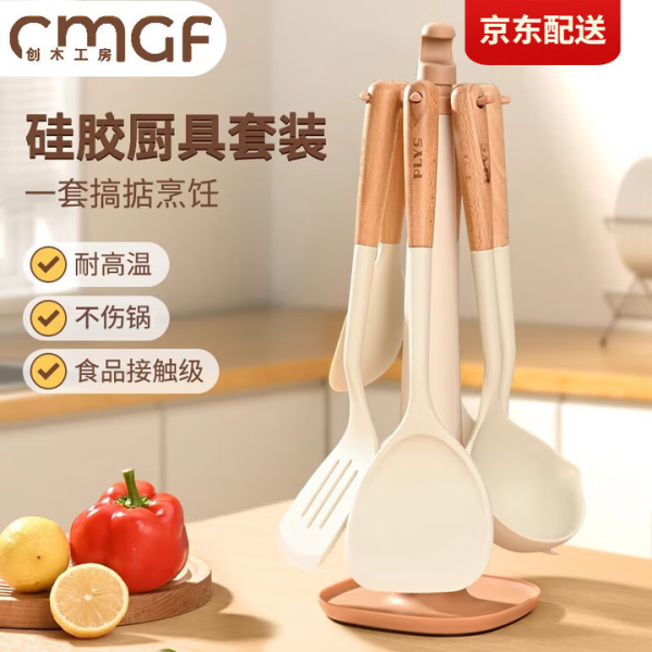 创木工房 锅铲勺套装耐高温硅胶家用锅铲汤勺漏勺煎铲饭勺组合 木柄奶白硅胶锅铲七件套