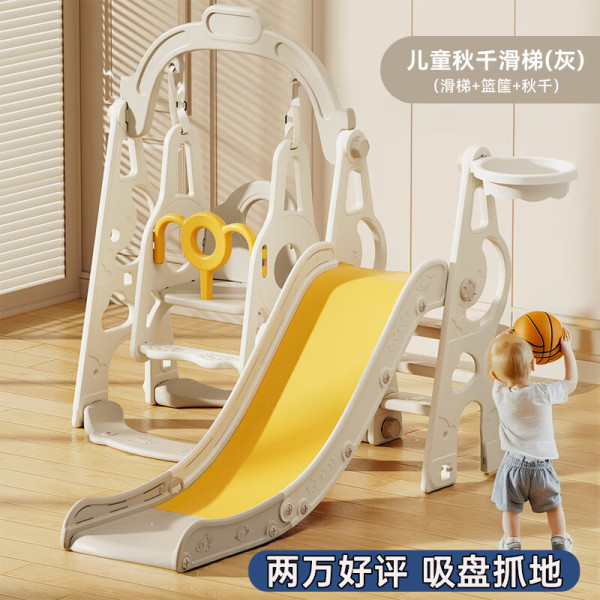 当康 室内滑滑梯儿童篮球架秋千婴儿围栏儿童乐园家用儿童滑梯游乐场 奶油灰-横梁加高三合一