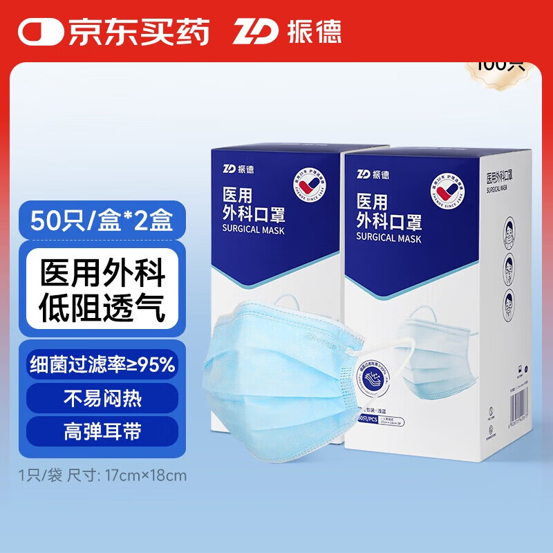 振德一次性医用外科口罩独立包装防尘花粉防晒口罩成人蓝色100只