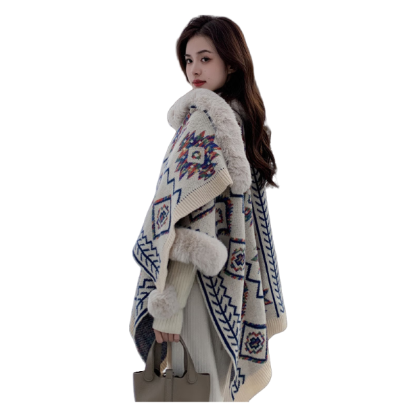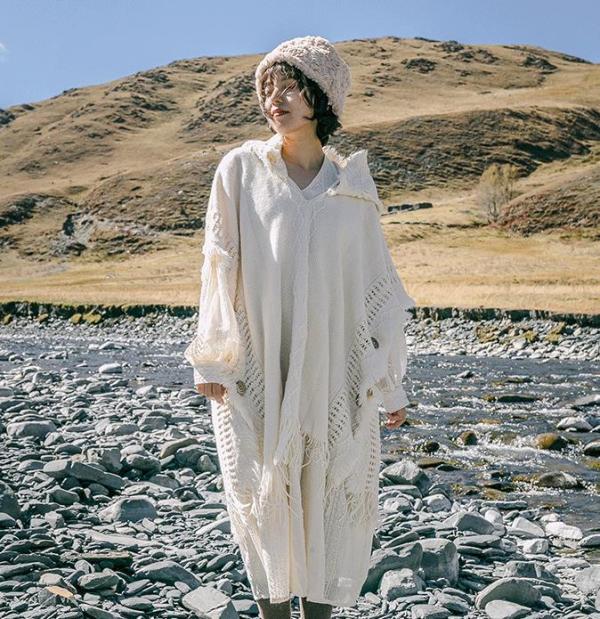槿城斗篷披肩云南丽江桂林民族风披肩旅游波西米亚流苏针织衫连帽mp58 奶白色