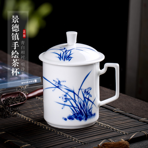 末都 景德镇手绘青花瓷陶瓷大茶杯个人带盖家用 办公室会议泡茶杯水杯 兰吐幽香【500ML】