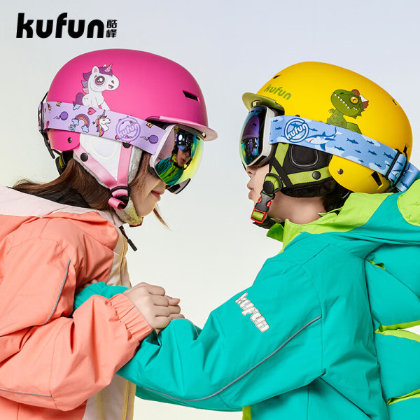 酷峰(kufun)儿童滑雪头盔雪盔雪镜男专业单板成人滑雪眼镜帽子女装备套装 绿恐龙 M码(适合头围55-58CM)
