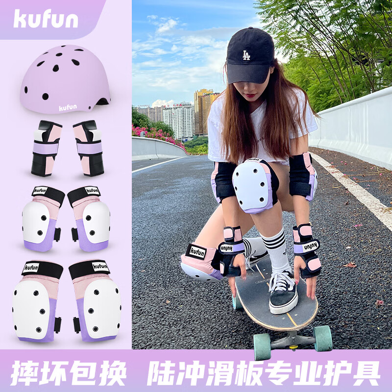 酷峰(kufun)轮滑护具全套头盔套装防护溜冰滑板滑雪陆冲板骑行成人儿童男女 7件套 粉紫护具 头盔 S适合28至65斤