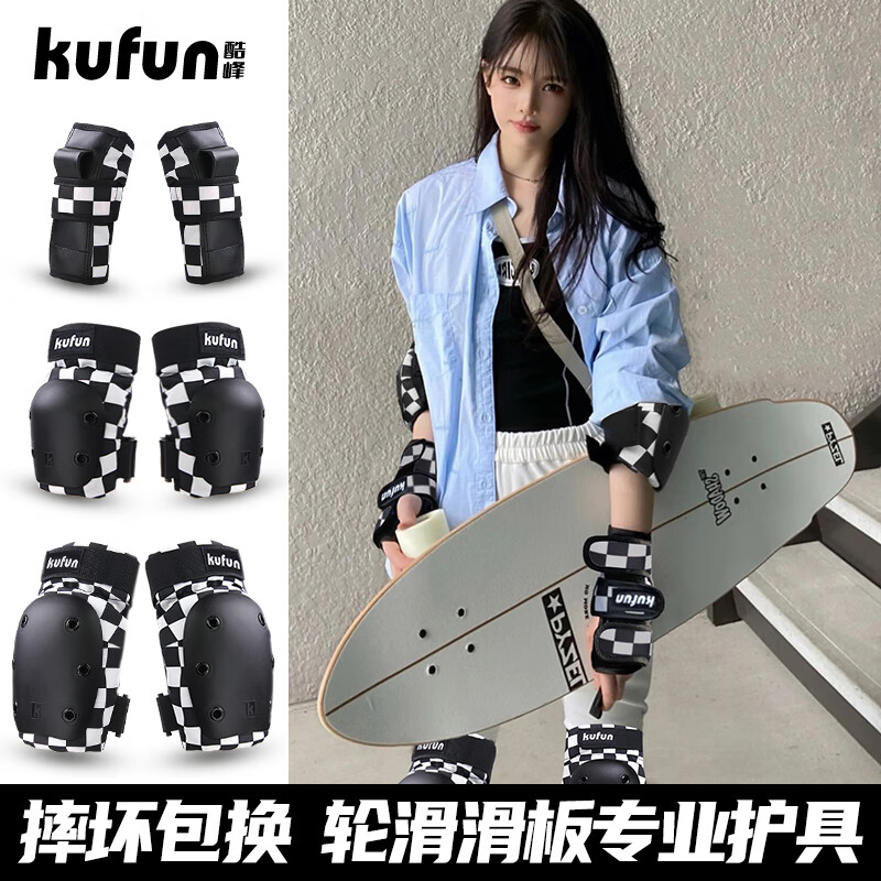 酷峰(kufun)轮滑护具全套头盔套装防护溜冰滑板滑雪陆冲板骑行成人儿童男女 6件套 棋盘格护具 XL适合150至210斤