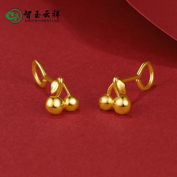 智玉云祥 999足金樱桃黄金耳钉女 水果樱桃金弯钩耳钩金耳饰七夕礼物送女友 单件 约0.85g-0.95g 弯钩款