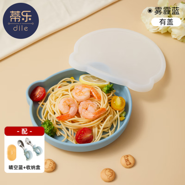 蒂乐宝宝餐盘硅胶吸盘一体式自主进食儿童辅食碗婴儿吃饭餐具 小熊餐盘-蓝+硅胶盖+大吸盘+叉勺