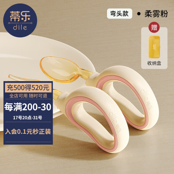 蒂乐婴儿辅食勺学吃饭叉勺子宝宝训练勺1岁自主进食勺子儿童餐具套装 柔雾粉-弯头【配收纳盒】