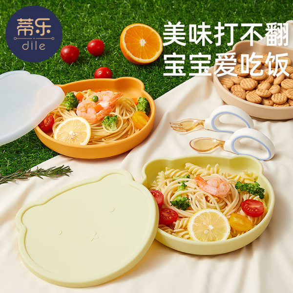 蒂乐宝宝餐盘硅胶吸盘一体式自主进食儿童辅食碗婴儿吃饭餐具 小熊餐盘-黄+硅胶防尘盖+大吸盘